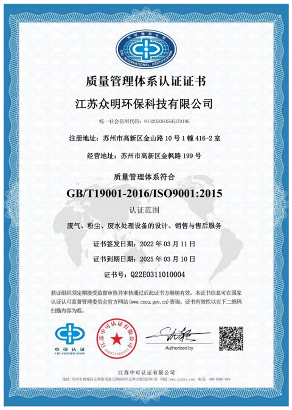 環(huán)境管理體系認(rèn)證證書
